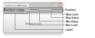 void OnGUI() { EditorGUI.MinMaxSlider( new Rect(0, 0, position.width, 20), new GUIContent("Random range:"), ref minVal, ref maxVal, minLimit, maxLimit); if (GUI.Button(new Rect(0, 25, position.width, position.height - 25), "Randomize!")) { PlaceRandomly(); } }
