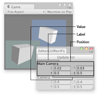 if (cameras.Length > 0) { for (var i = 0; i < cameras.Length; i++) { cameras[i].rect = EditorGUI.RectField( new Rect(3, 25 + 45 * i, position.width - 6, 25), cameras[i].name, cameras[i].rect); } } } }