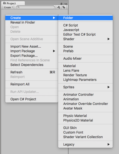 首先,创建一个新文件夹以放置需要添加到 AssetBundle 的资源。要执行此操作,请在 Project 窗口内右键单击,然后选择 Create > Folder__(或单击 Project 窗口左上角的 Create__ > __Folder__)。