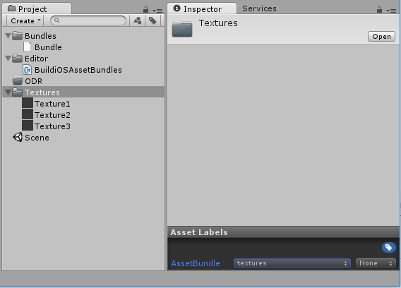 In this example, the Textures folder has the label textures and the new script BuildiOSAssetBundles.cs is created in the Editor folder.