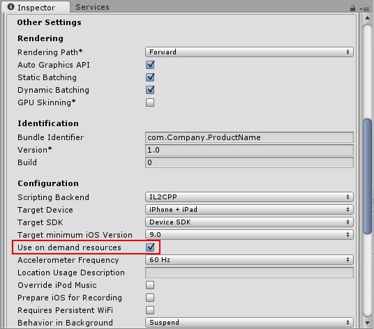 如果尚未选中相关选项,请单击 iOS__,然后单击 Switch Platform__ 按钮。接下来,单击 Player Settings 按钮。在 Inspector 窗口中,打开 Other Settings__,导航到 Configuration__ 部分,然后启用 Use on demand resources 复选框。