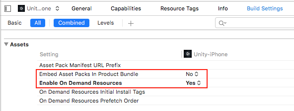 在 Xcode 中构建 .IPA 之前,请检查 XCode 的 Build Settings,确保 Assets 部分中的 Embed Asset packs In Product Bundle 设置为 No__,而 Enable On Demand Resources__ 设置为 Yes。
