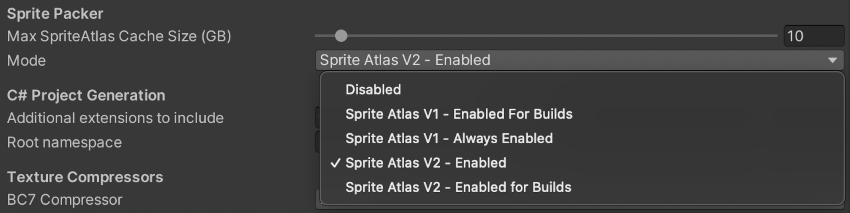 Sprite Atlas V2 - Enabled Select this mode to have Unity pack Sprites into the Sprite Atlas immediately when there are any changes. The packed Sprite Atlas is available when the project enters Play mode or when publishing a build.