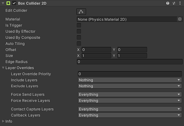 | Layer Override Priority | Assign the decision priority that this Collider2D uses when resolving conflicting decisions on whether a contact between itself and another Collision2D should happen or not. Refer to its API page for more information. | |