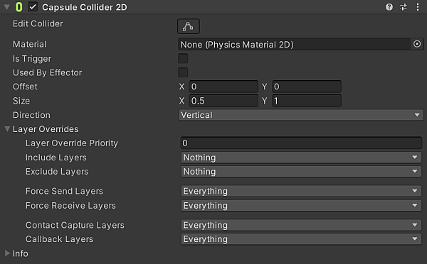 A typical way to set up the Capsule Collider 2D is to set the Size to match the Direction. For example, if the Capsule Collider 2D’s Direction is Vertical, the Size of X is 0.5 and the Size of Y is 1, this makes the vertical direction capsule taller, rather than wider.