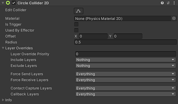 | Radius | Set the radius of the Circle Collider 2D in local space units. | |