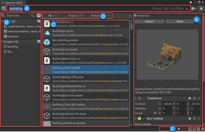 | A | Search field | Enter your search query here. For details about all the ways you can search Unity with Search, see Using Search. |