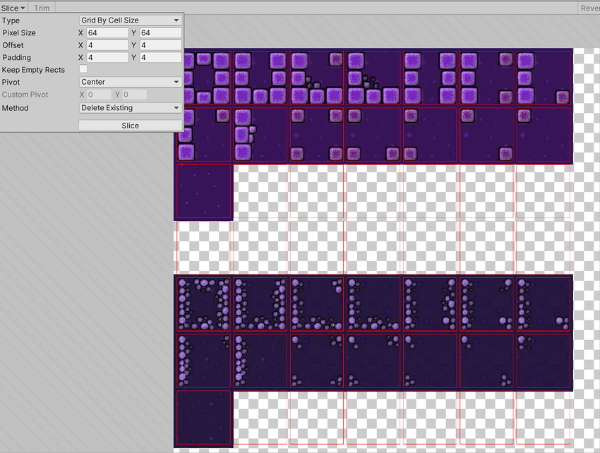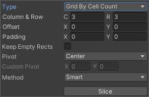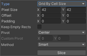 Grid by Cell Size or Grid by Cell Count options are also available for the slicing type. This is very useful when the sprites have already been laid out in a regular pattern during creation: