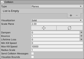 | Visualize Bounds | Renders the collision bounds of each particle as a wireframe shape in the Scene view. |