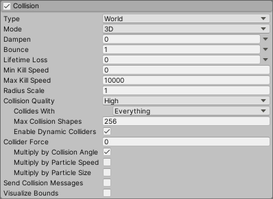 | Multiply by Particle Speed | When applying forces to Colliders, scale the strength of the force based on the speed of the particle. Fast-moving particles will generate more force than slower ones. |