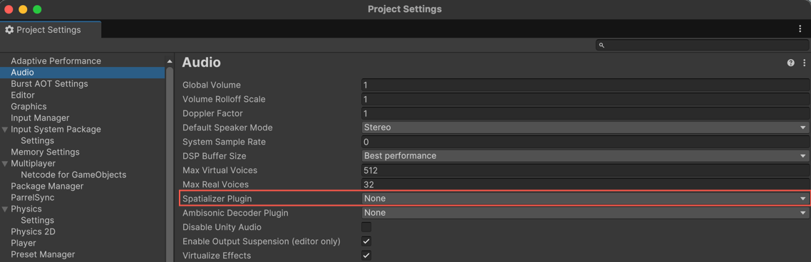 After you have added the package containing an audio spatializerA plug-in that changes the way audio is transmitted from an audio source into the surrounding space. It takes the source and regulates the gains of the left and right ear contributions based on the distance and angle between the AudioListener and the AudioSource. More info