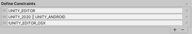 UNITY_IOS || UNITY_EDITOR_OSXUNITY_2019_3_OR_NEWER!UNITY_ANDROIDThe constraints are satisfied when either UNITY_IOS or UNITY_EDITOR_OSX and UNITY_2019_3_OR_NEWER are defined and UNITY_ANDROID is not defined. Individual lines are analogous to performing a logical AND operation between the constraints in them. The above example is equivalent to: