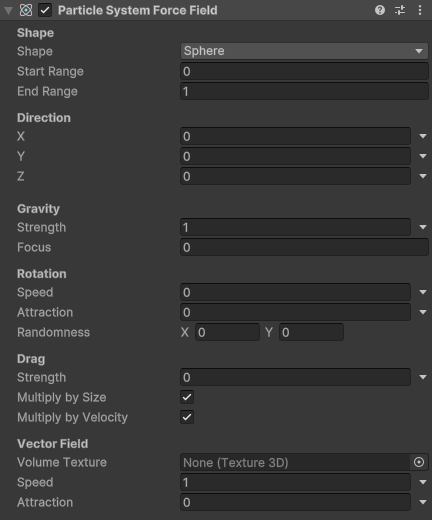 The Particle System Force Field component applies forces to particles in Particle SystemsA component that simulates fluid entities such as liquids, clouds and flames by generating and animating large numbers of small 2D images in the scene. More info