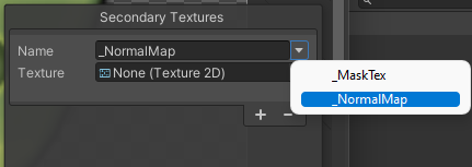 This adds a new entry to the list with the ‘Name’ and ‘Texture’ boxes. Enter a custom name into the Name box, or select the arrow to the right of the Name box to open the drop-down list of suggested names. These suggested names can include suggestions from installed Unity packages, as the Secondary Textures may need to have specific names to interact correctly with the ShadersA program that runs on the GPU. More info
