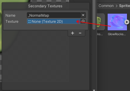 Secondary Textures are sampled with the same UV coordinates as the Texture of the selected Sprite. Align the Secondary Textures with the main Sprite Texture to ensure that additional Texture effects are displayed correctly.