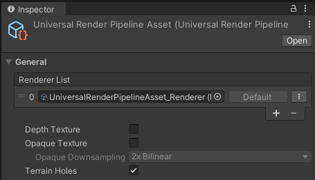 The 2D Renderer is now set up for your Project. Note: If you use the 2D Renderer in your Project, some of the options related to 3D rendering in the Universal Render Pipeline Asset will not affect or impact on your final app or game.