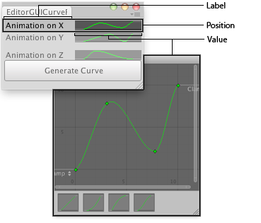 void OnGUI() { curveX = EditorGUI.CurveField( new Rect(3, 3, position.width - 6, 50), "Animation on X", curveX); curveY = EditorGUI.CurveField( new Rect(3, 56, position.width - 6, 50), "Animation on Y", curveY); curveZ = EditorGUI.CurveField( new Rect(3, 109, position.width - 6, 50), "Animation on Z", curveZ);