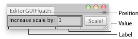 void OnGUI() { sizeMultiplier = EditorGUI.FloatField(new Rect(3, 3, 150, 20), "Increase scale by:", sizeMultiplier);