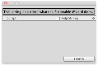 public class HelpString : ScriptableWizard { [MenuItem("Example/Show Help String")] static void CreateWindow() { ScriptableWizard.DisplayWizard("", typeof(HelpString), "Finish"); }