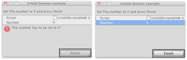 public class isValidScriptableWizard : ScriptableWizard { public int number = 0; [MenuItem("Example/Show isValid Usage")] static void CreateWindow() { ScriptableWizard.DisplayWizard( "isValid boolean example", typeof(isValidScriptableWizard), "Finish"); }