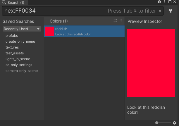 [SearchItemProvider] internal static SearchProvider CreateProvider() { return new SearchProvider(id, name) { filterId = "hex:", priority = 99999, // put example provider at a low priority showDetailsOptions = ShowDetailsOptions.Description | ShowDetailsOptions.Preview, fetchItems = (context, items, provider) => { var expression = context.searchQuery; if (expression.Length == 6 && IsHex(expression)) { expression = "#" + expression; items.Add(provider.CreateItem(context, expression, GetColorName(expression), "Look at this " + GetColorName(expression) + " color!", CreateTextureFromColor(expression, 64, 64), null)); } return null; }, fetchPreview = (item, context, size, options) => { return CreateTextureFromColor(item.id, (int)size.x, (int)size.y); }, }; }
