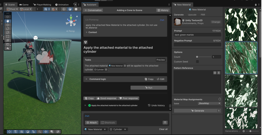 Create with AI-powered tools in the Unity Editor and Dashboard. Use Assistant for contextual help, Generators for asset creation, and Sentis to run models at runtime.