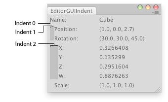 // Indent further again the area of rotation values EditorGUI.indentLevel++; EditorGUILayout.LabelField("X:", obj.rotation.x.ToString()); EditorGUILayout.LabelField("Y:", obj.rotation.y.ToString()); EditorGUILayout.LabelField("Z:", obj.rotation.z.ToString()); EditorGUILayout.LabelField("W:", obj.rotation.w.ToString());