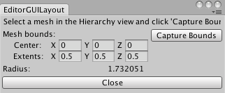 void OnGUI() { GUILayout.Label("Select a mesh in the Hierarchy view and click 'Capture Bounds'"); EditorGUILayout.BeginHorizontal(); bounds = EditorGUILayout.BoundsField("Mesh bounds:", bounds);