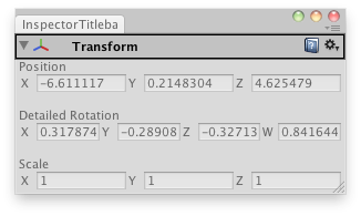 public class InspectorTitlebarExample : EditorWindow { bool fold = true; Vector4 rotationComponents; Transform selectedTransform;