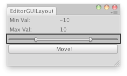 void OnGUI() { EditorGUILayout.LabelField("Min Val:", minVal.ToString()); EditorGUILayout.LabelField("Max Val:", maxVal.ToString()); EditorGUILayout.MinMaxSlider(ref minVal, ref maxVal, minLimit, maxLimit); if (GUILayout.Button("Move!")) PlaceRandomly(); }