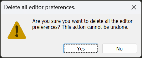 public class DeleteAllExample : ScriptableObject { [MenuItem("Examples/EditorPrefs/Clear all Editor Preferences")] static void deleteAllExample() { if (EditorUtility.DisplayDialog("Delete all editor preferences.", "Are you sure you want to delete all the editor preferences? " + "This action cannot be undone.", "Yes", "No")) { Debug.Log("yes"); EditorPrefs.DeleteAll(); } } }